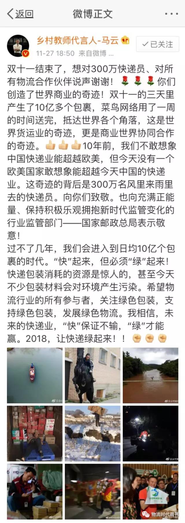 物流好专线一网连中华  “未来的快递业,‘快’保证不输,‘绿’才能赢。2018,让快递绿起来!”马云在微博中说。